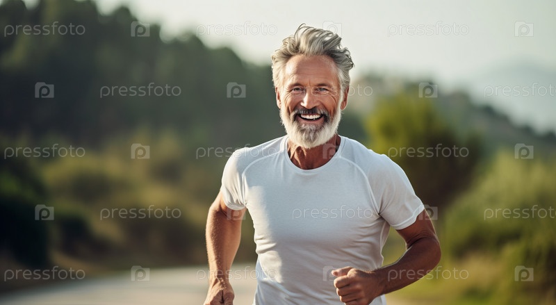 Портрет счастливого пожилого мужчины с седыми волосами и бородой в спортивной одежде