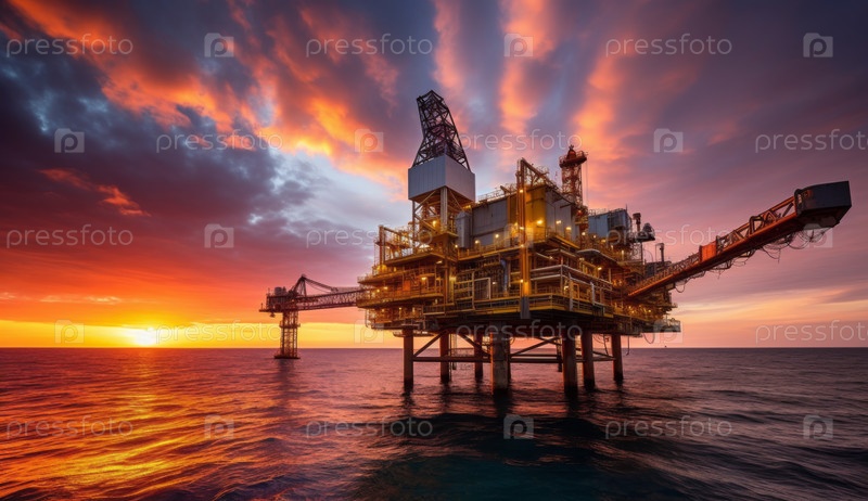 Буровая установка для добычи нефти в океане под закатным небом