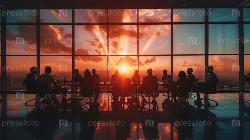 Совместная работа команды в офисе со стеклянными стенами на закате