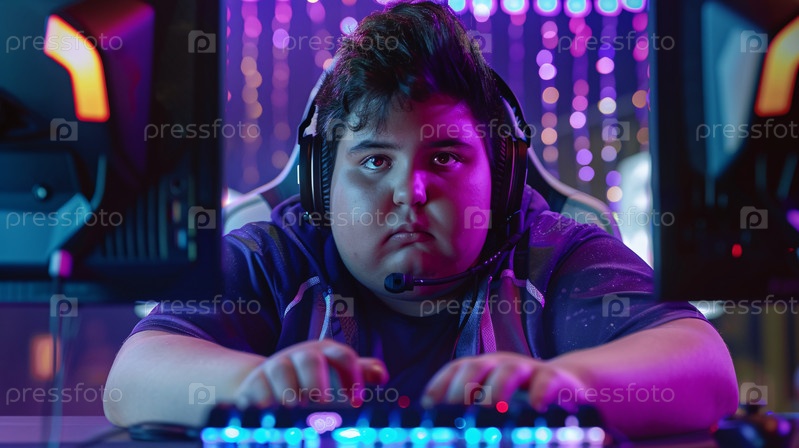 Молодой геймер играет в онлайн-игру с красочной обстановкой