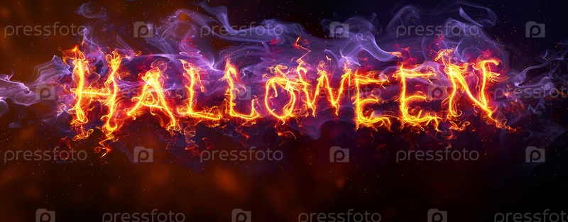 Огненный текст на Хэллоуин со светящимся пламенем и таинственным дымом