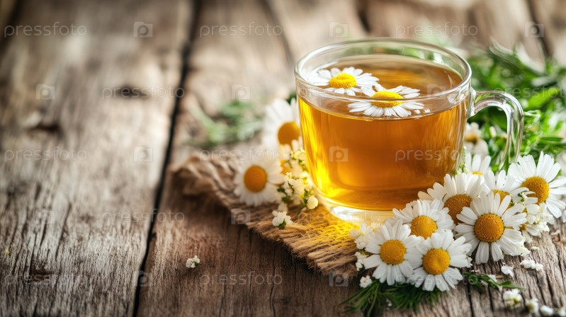 Освежающая чашка ромашкового чая с цветочными акцентами