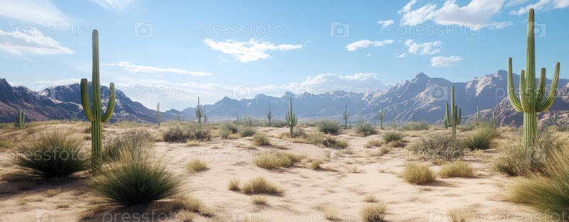 Залитая солнцем пустыня с кактусами сагуаро и красными скалами