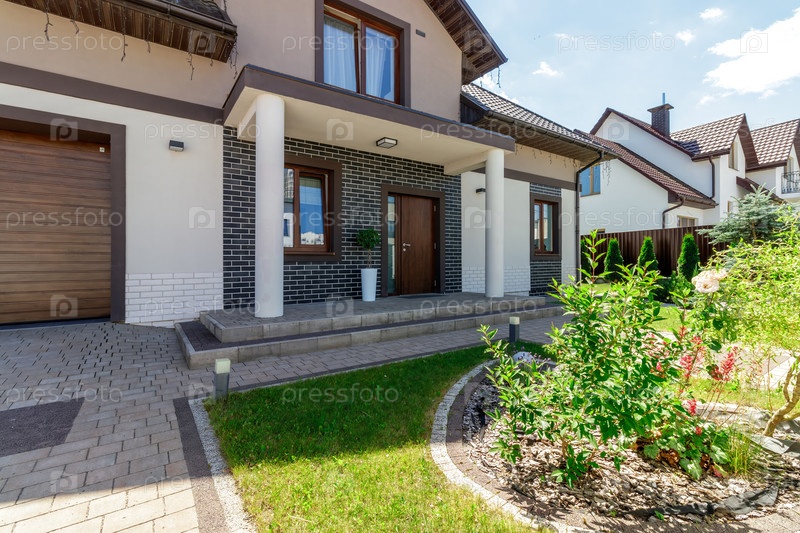 Великолепно спроектированный современный дом с кирпичными деталями, благоустроенным двором и уютной входной дорожкой