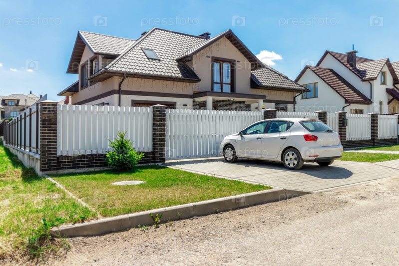 Современный загородный дом с подъездной дорожкой с припаркованной машиной, белым забором, кирпичными деталями и ясным солнечным небом