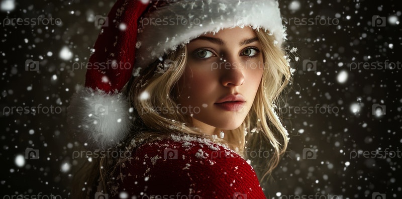Женщина в шапке Санты стоит среди мягко падающего снега, олицетворяя праздничную радость и тепло предновогоднего сезона