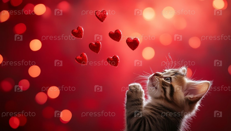 Два пушистых котенка смотрят на висящие сердца, окруженные красными огнями боке, в очаровательной романтической сцене, идеально подходящей для тематики Дня святого Валентина