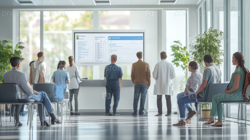Современный зал ожидания больницы с пациентами и медицинским персоналом