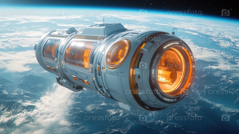 Футуристическая космическая станция на орбите Земли со светящимися огнями
