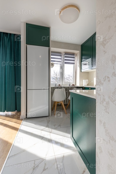 Современная кухня с зелеными шкафами, белым холодильником, уютной зоной для завтрака у окна и естественным светом, освещающим мраморный пол