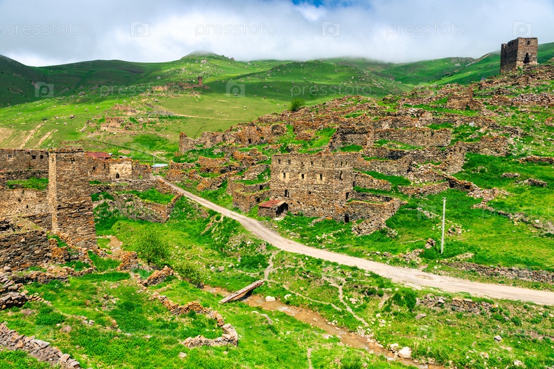 Древние живописные руины горного села Галиат. Северный Кавказ. Россия