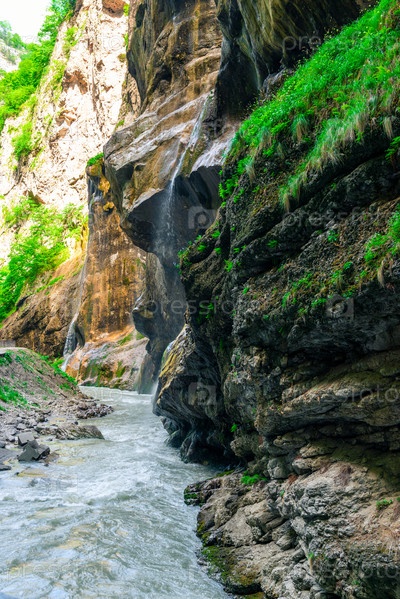 Горная река у крутой скальной стены Чегемских хребтов. Кабардино-Балкария. Россия