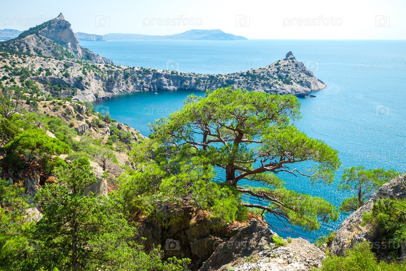 Живописная сосна на скалистом склоне на фоне моря и мыса Капчик. Крымский полуостров. Россия