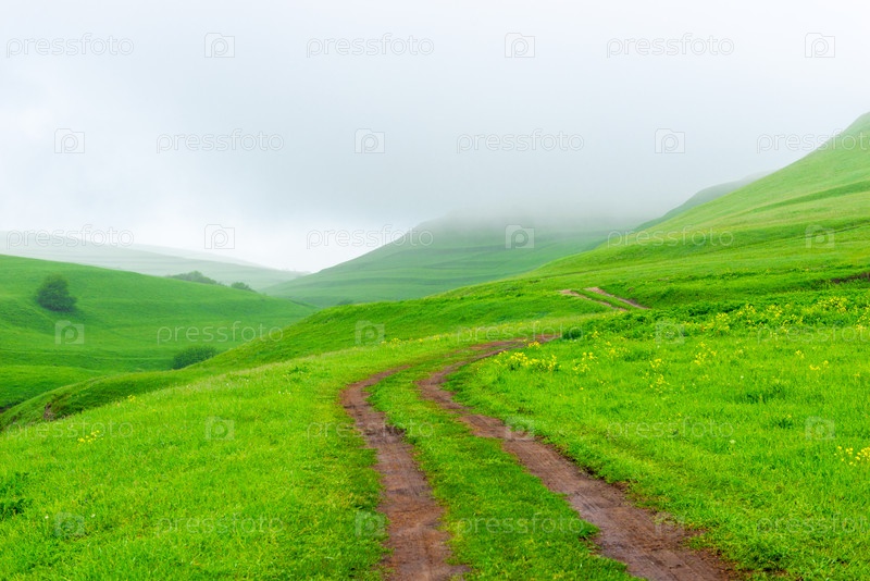 Грунтовая дорога на горном плато среди живописных зеленых холмов. Горы Северного Кавказа. Россия