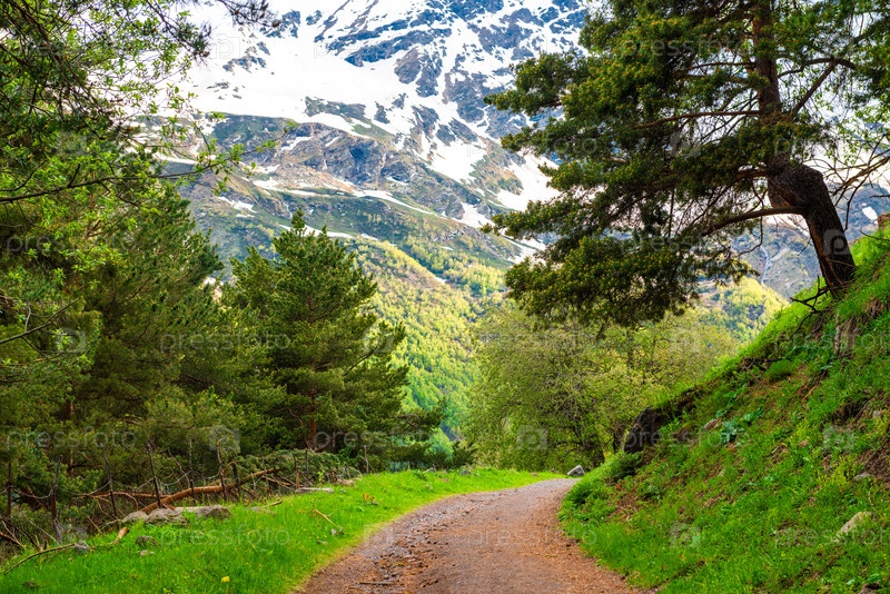 Живописная горная тропа с соснами на фоне заснеженного обрыва. Горы Северного Кавказа. Россия