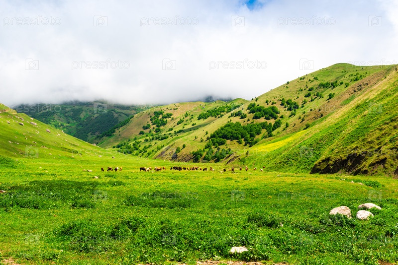 Стадо коров пасется на зеленом лугу высоко в горах. Северный Кавказ. Россия