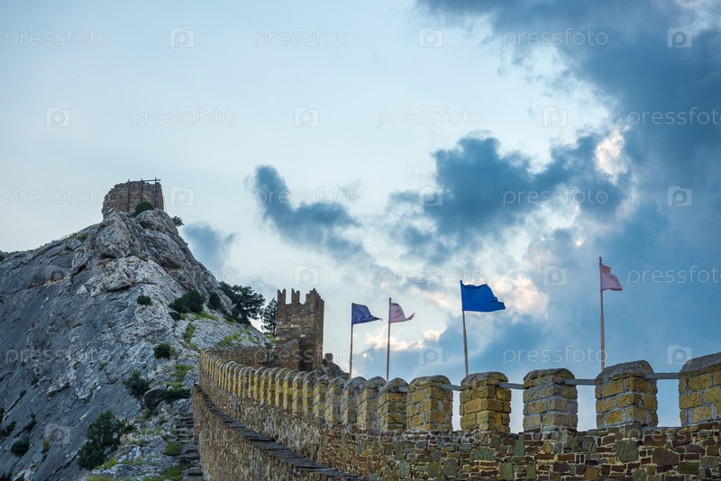 Драматический пейзаж с крепостной стеной Генуэзской крепости в городе Судак. Крымский полуостров. Россия