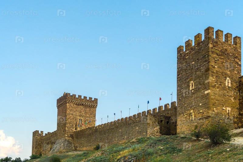 Красивый вид на крепостную стену с башнями Генуэзской крепости в городе Судак. Крымский полуостров. Россия