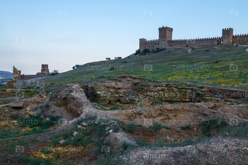 Живописный вид на руины и крепостную стену Генуэзской крепости в городе Судак. Крымский полуостров. Россия