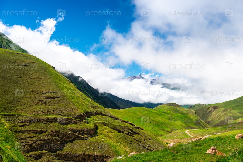 Прекрасный вид на высокие зеленые горы среди облаков. Северный Кавказ. Россия