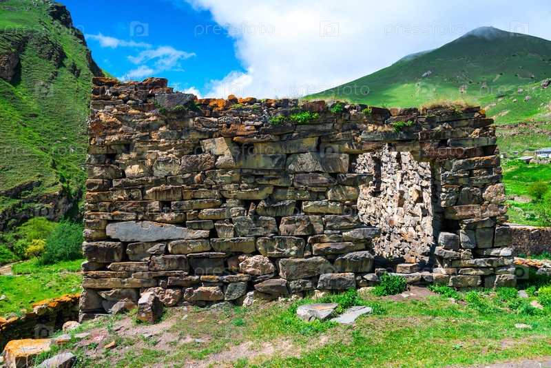 Древние живописные руины горного села Галиат. Северный Кавказ. Россия