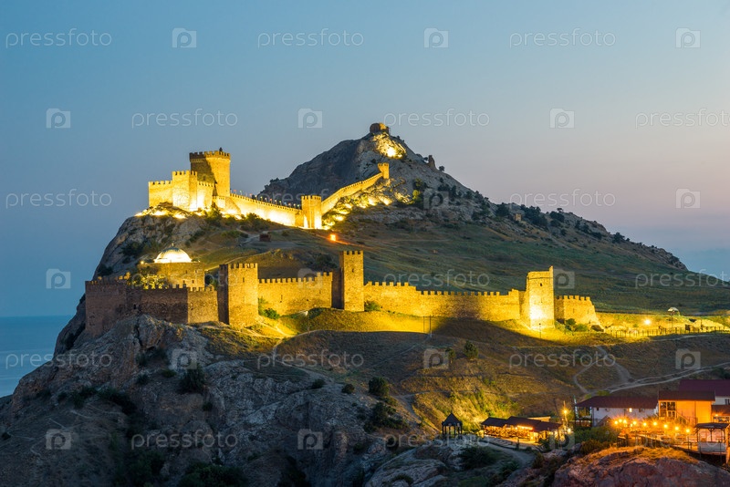 Ночной вид на старую Генуэзскую крепость в городе Судак. Крымский полуостров. Россия