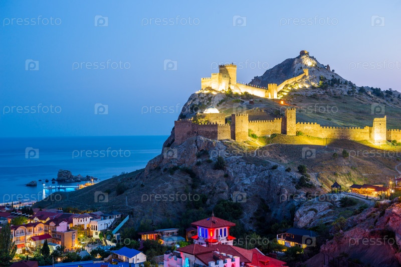 Ночной вид на старую Генуэзскую крепость в городе Судак. Крымский полуостров. Россия