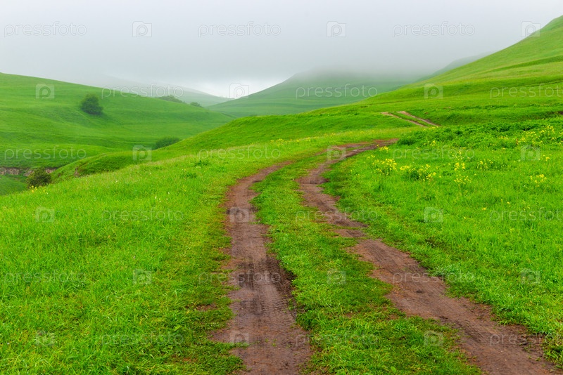 Грунтовая дорога на горном плато среди живописных зеленых холмов. Горы Северного Кавказа. Россия