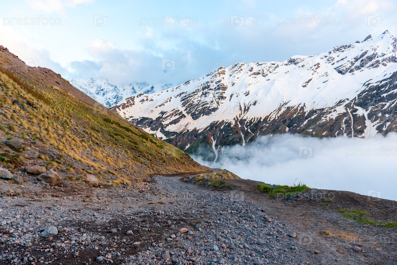 Горная тропа, спускающаяся по крутому склону к живописному водопаду. Северный Кавказ. Россия