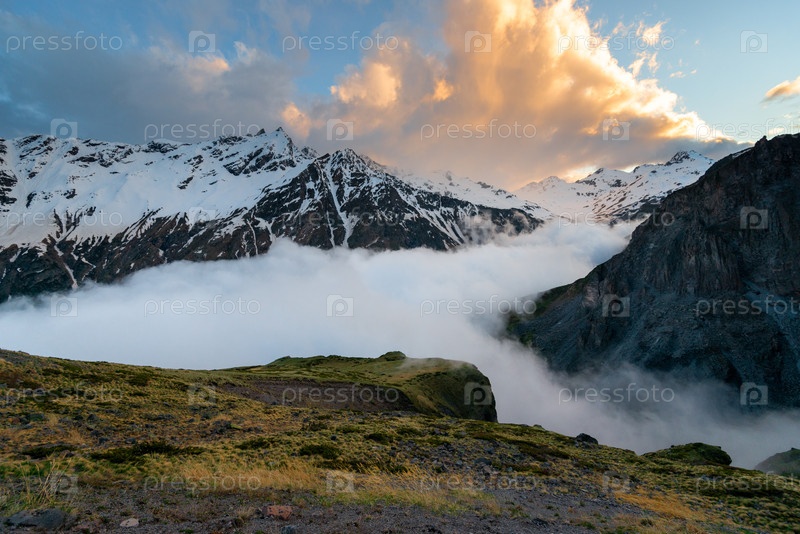 Красивый вид на суровые снежные вершины Эльбруса на закате с низкими облаками. Северный Кавказ. Россия