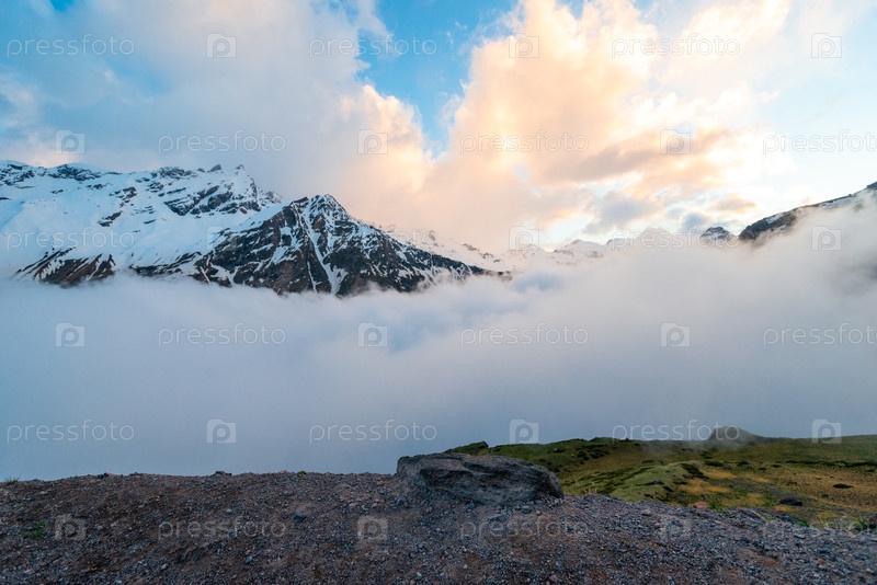Высокие снежные вершины Эльбруса в облаках на закате. Северный Кавказ. Россия