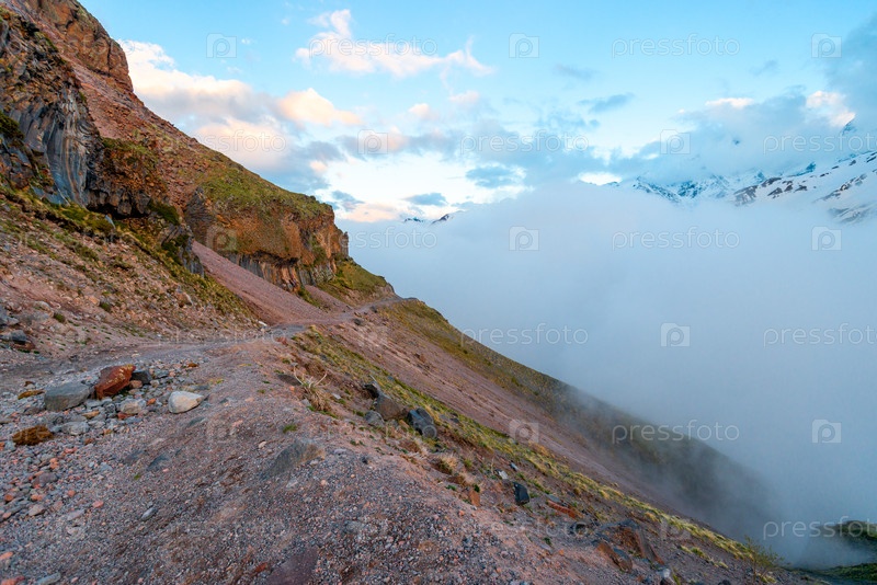 Опасная горная тропа в тумане на склоне скалы. Северный Кавказ. Россия