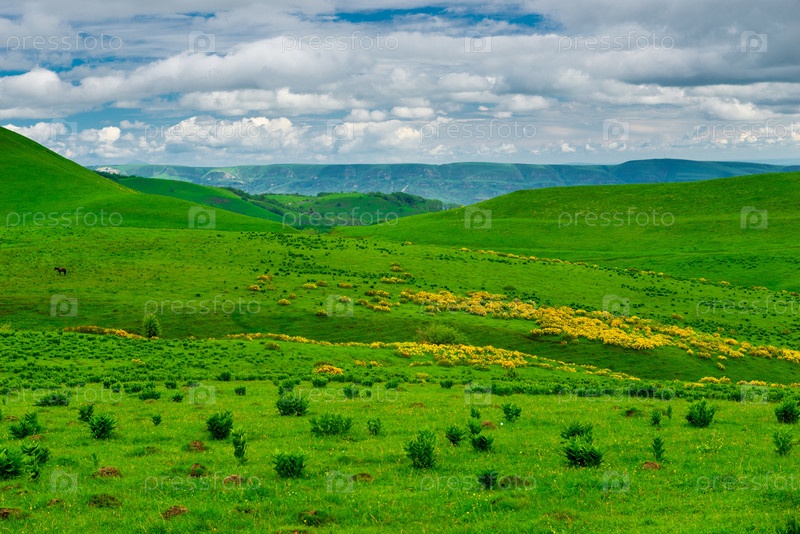 Живописные зеленые холмы в пасмурную погоду. Кавказ