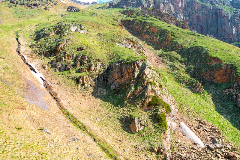 Зеленый скалистый склон Эльбруса в ясную солнечную погоду. Северный Кавказ