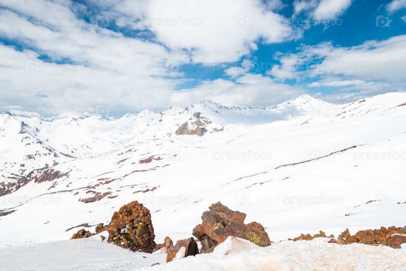 Живописный вид на заснеженный склон скалистой горы. Эльбрус. Кавказ