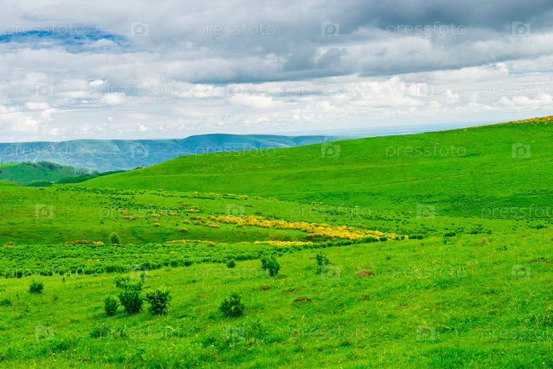 Живописные зеленые холмы в пасмурную погоду. Кавказ