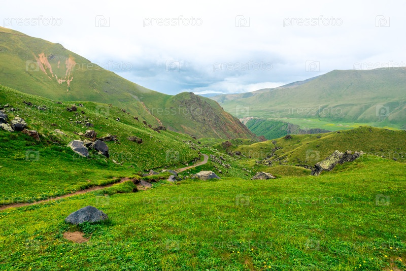 Потрясающий живописный вид на зеленые горы с сочной травой в Приэльбрусье