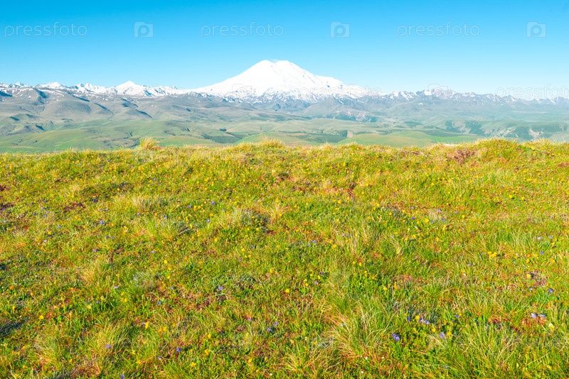 Альпийская растительность на фоне заснеженной вершины Эльбруса в солнечную погоду