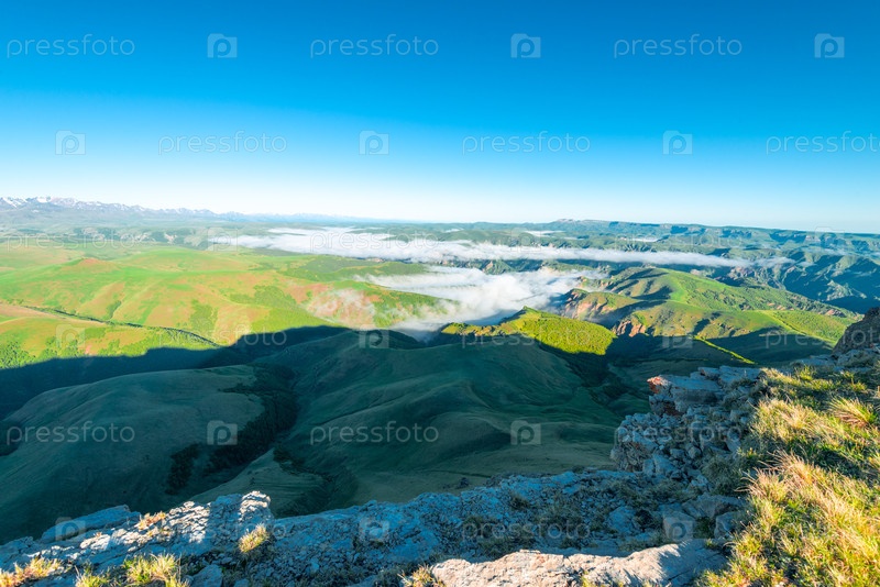 Низкие облака покрывают невысокие зеленые горы в горной местности Приэльбрусья