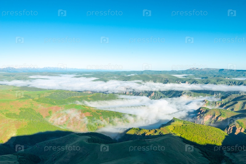 Низкие облака покрывают невысокие зеленые горы в горной местности Приэльбрусья
