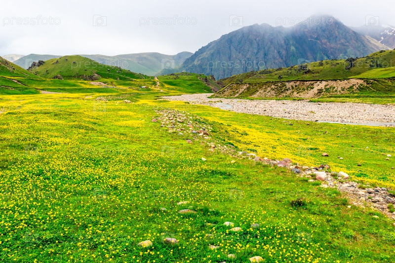 Живописный вид на горное русло реки в пасмурную погоду. Приэльбрусье