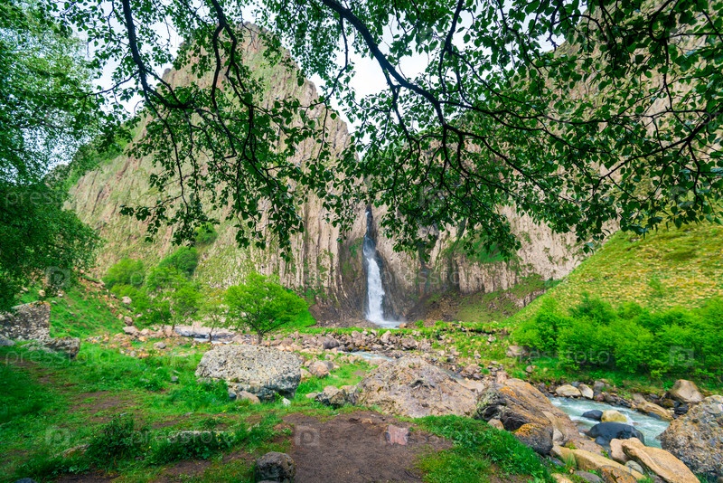 Бурный поток водопада Каракая-Су в долине реки Малка срывается с крутой скалы. Приэльбрусье