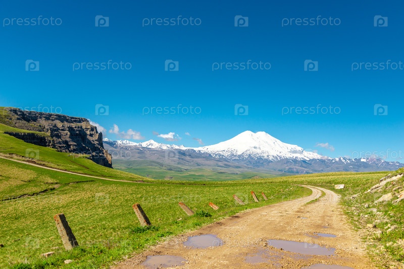 Грунтовая дорога на плато, ведущая к плато Канжол с видом на вулкан Эльбрус. Россия