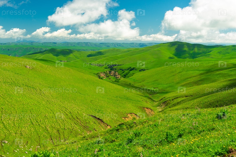 Красивый пейзаж с невысокими зелеными холмами в солнечную погоду. Кавказ