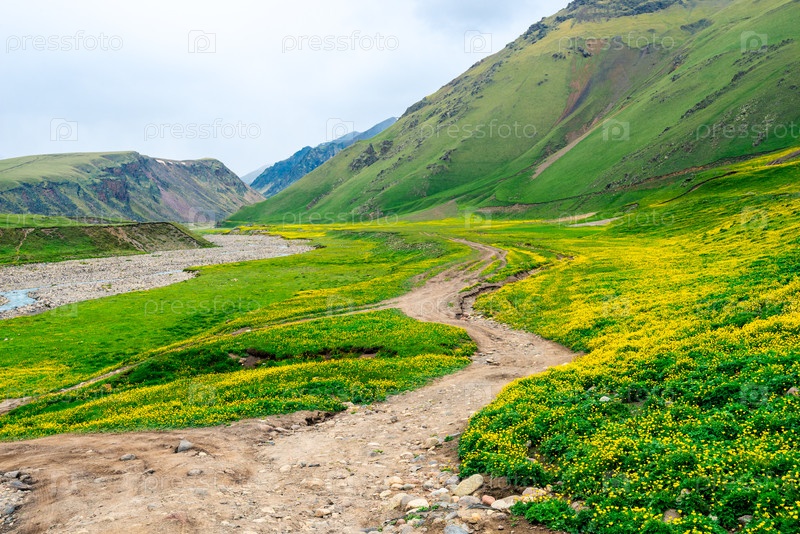 Живописный пейзаж с грунтовой дорогой, спускающейся в долину Эммануэль в Приэльбрусье