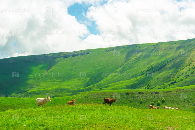 Стадо коров пасется на зеленом склоне в Приэльбрусье