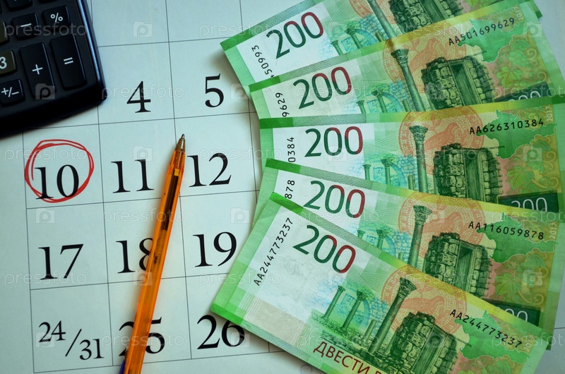 Выделенная дата на календаре, шариковая ручка, калькулятор и деньги