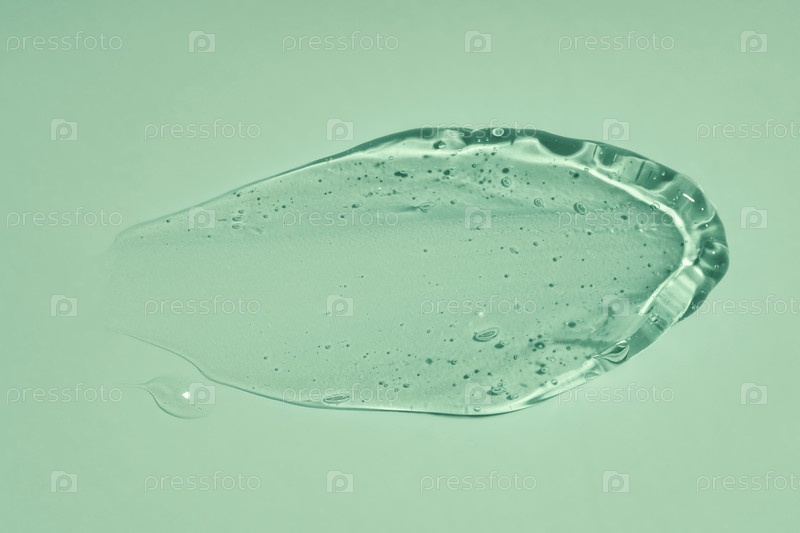 Жидкий гель мазок, изолированный на зеленом фоне. Красота косметического пятна, такого как чистый прозрачный лосьон алоэ, сыворотка желе для лица, очищающее средство, гель для душа или шампунь вид сверху