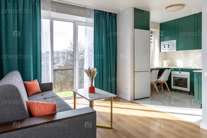 Современная гостиная и кухня открытой планировки с серым диваном, зелеными шкафами, мраморным журнальным столиком и большими окнами, пропускающими естественный свет