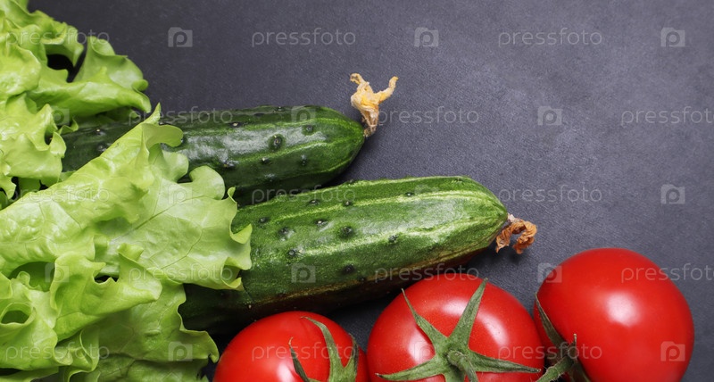 Зеленый салат, красные спелые помидоры на ветке, свежие огурцы и красный болгарский перец паприка. Овощи на черном текстурированном фоне